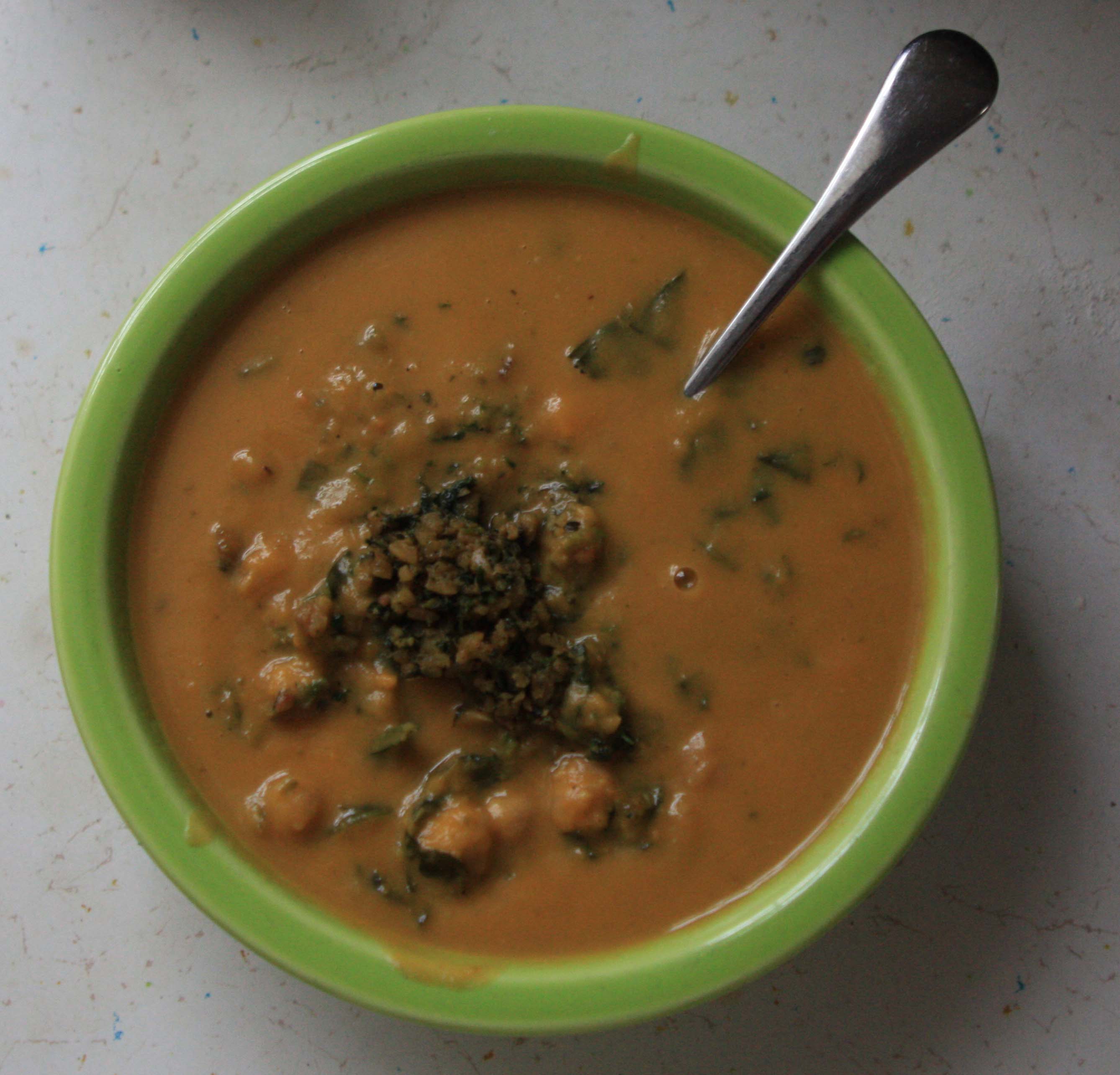 I pulled out my new Easy Vegan cookbook yesterday afternoon & was determined to make something from it. I realized I had most of the ingredients on hand for ‘sweet potato & coconut soup with Thai pesto’ and so went for it. The photo in the cookbook of the slightly chunky soup looked to me like it had chickpeas in there, so that was the launching pad I used to make this soup my own.