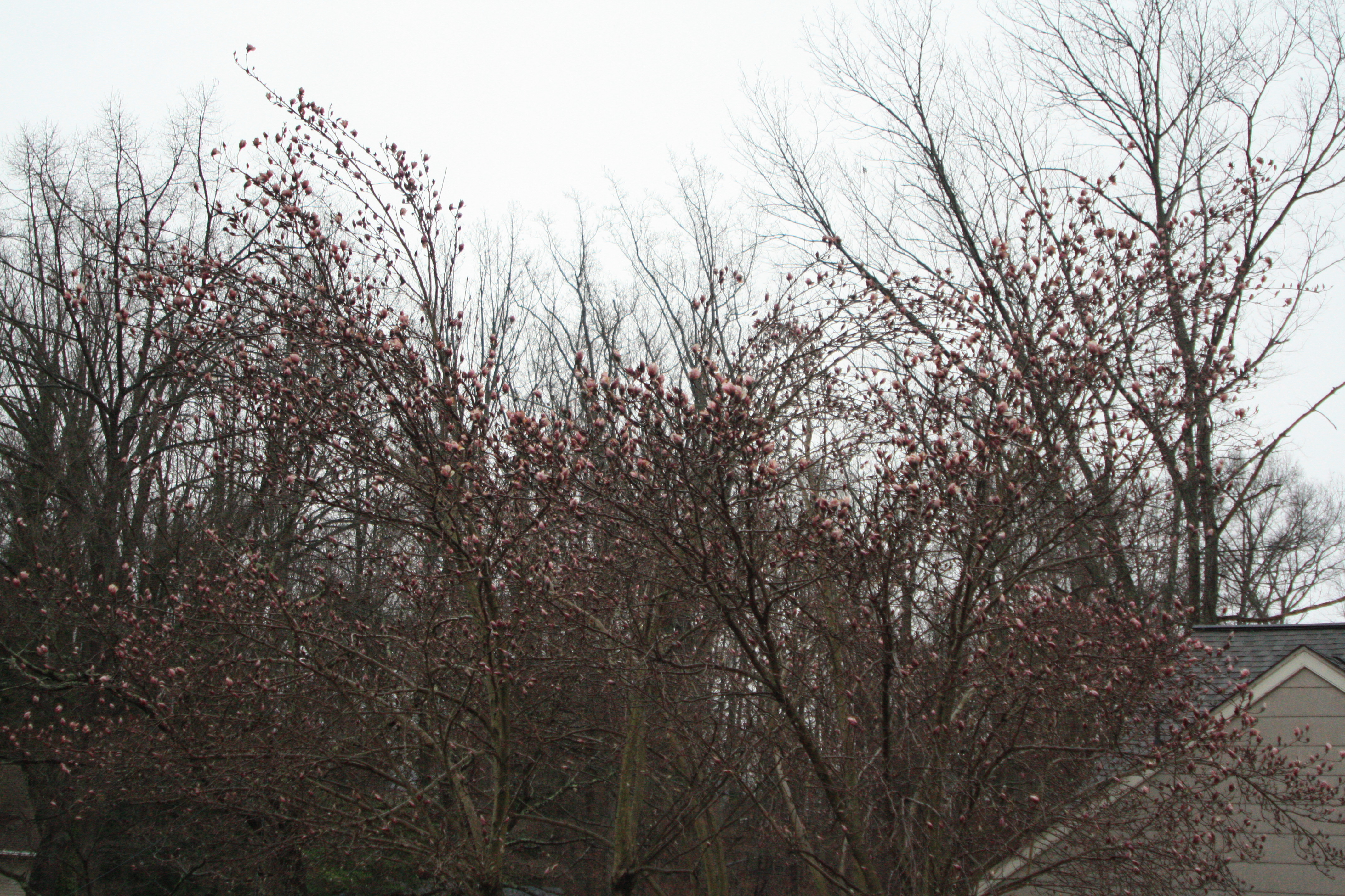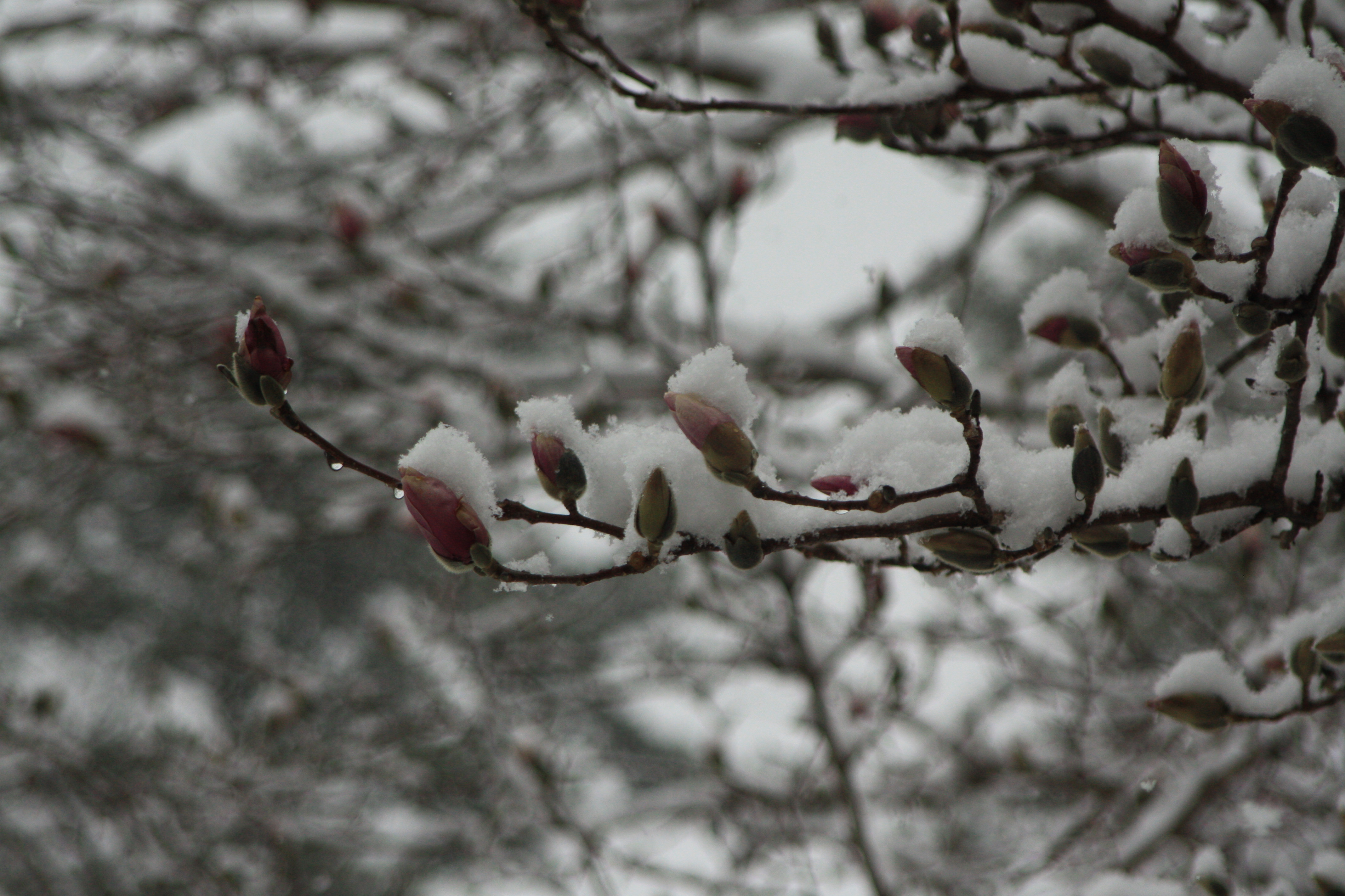 I’m pretty sure the tulip magnolia in the front yard is going to bloom while we’re away.  It would be nice to come home to spring, considering the forecast has us driving through snow on our way south today.  (!!)  After all the snow we’ve gotten while this poor tree has tried to bloom over the last few weeks,  we were pretty sure the pink gloriousness had been squished.  We noticed in the rain yesterday that while there are some brown spots on some of the buds, overall the tree appears pink!  This tree, while the earliest to bloom every spring, is quite susceptible to the weather. It can quickly turn brown from a heavy frost or late snowfall.  We’re not totally out of the woods yet with this tree, but it’s not as bad as we thought it was going to be on Wednesday after the latest 6 inches melted.