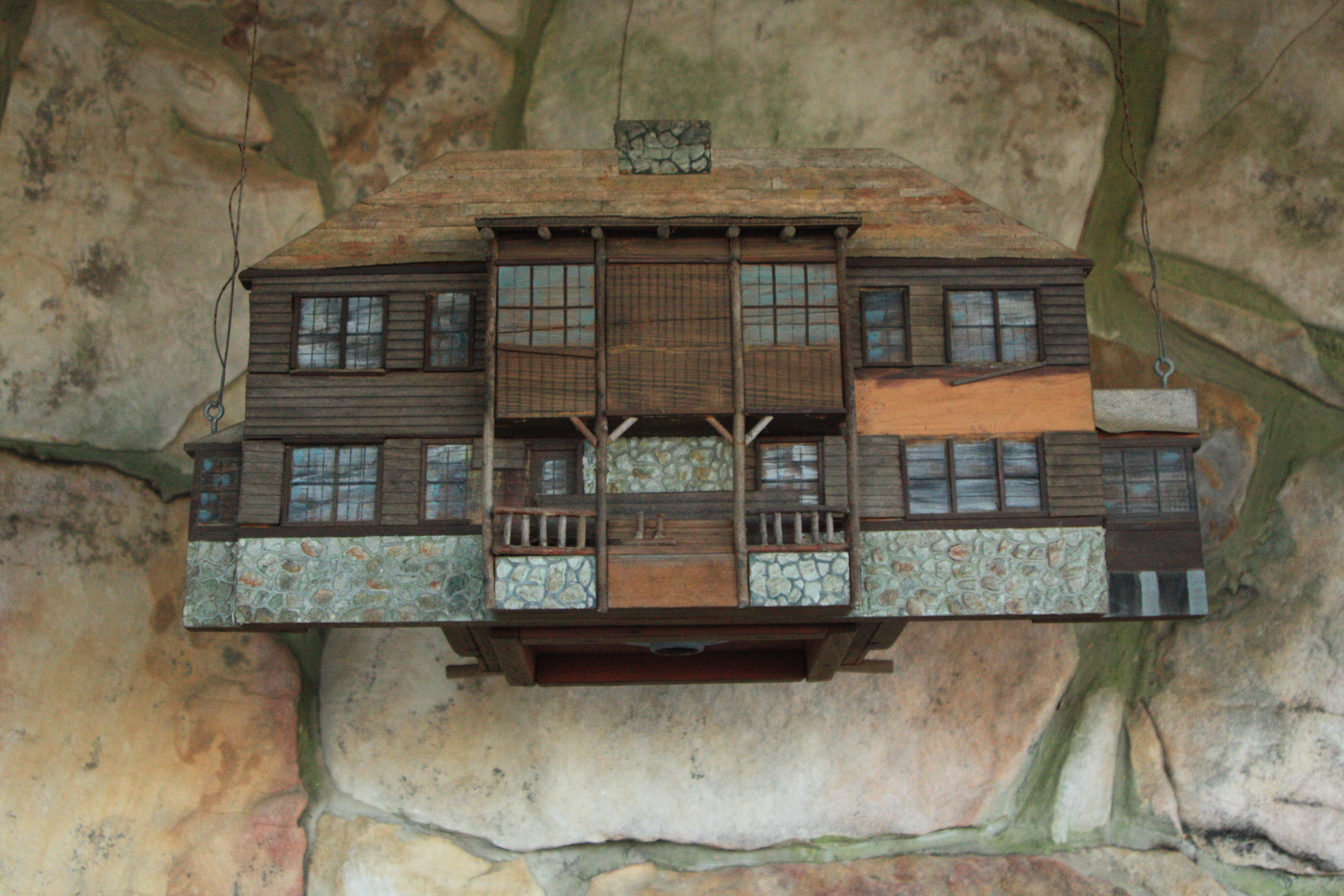 That is a scale model replica of the rear elevation of the lodge that hangs among the numerous bird houses on the rear screened in porch. The sort of porch that has ceiling fans, lamps and multiple seating areas. The lodge itself is so incredibly picturesque.