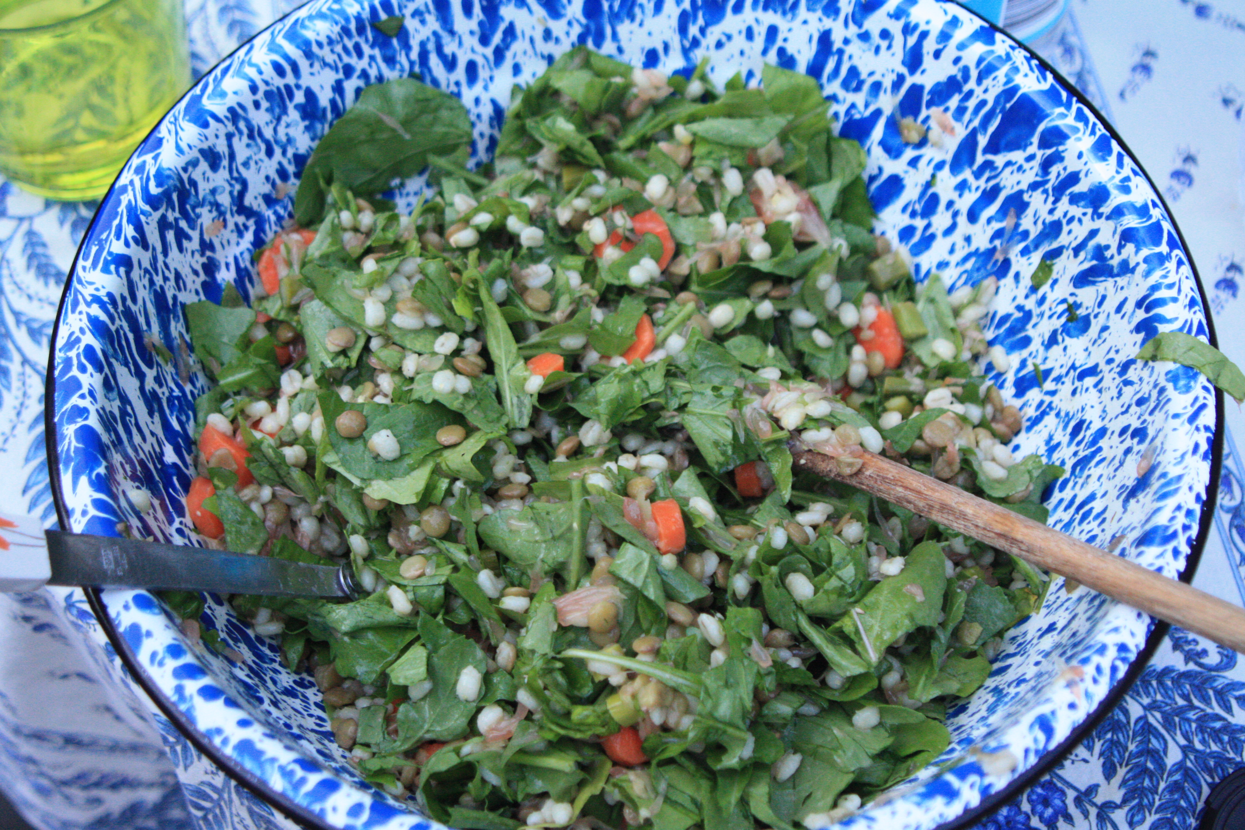 spring 1813It was not all fun and dessert fail though.  On the cooking success side of things, I made a few variations of  my go-to potluck salad that incorporates lentils, barley (or whatever other grain I have on hand), whatever greens are currently gangbusters in the garden (currently: arugula)  as well as anything else in the fridge or pantry that seems like it might work. Having taken a bowl of this along to Dahlia & Aaron’s Sunday evening, I overheard Dahlia telling another guest I’d no doubt have the recipe up and blogged by Wednesday.