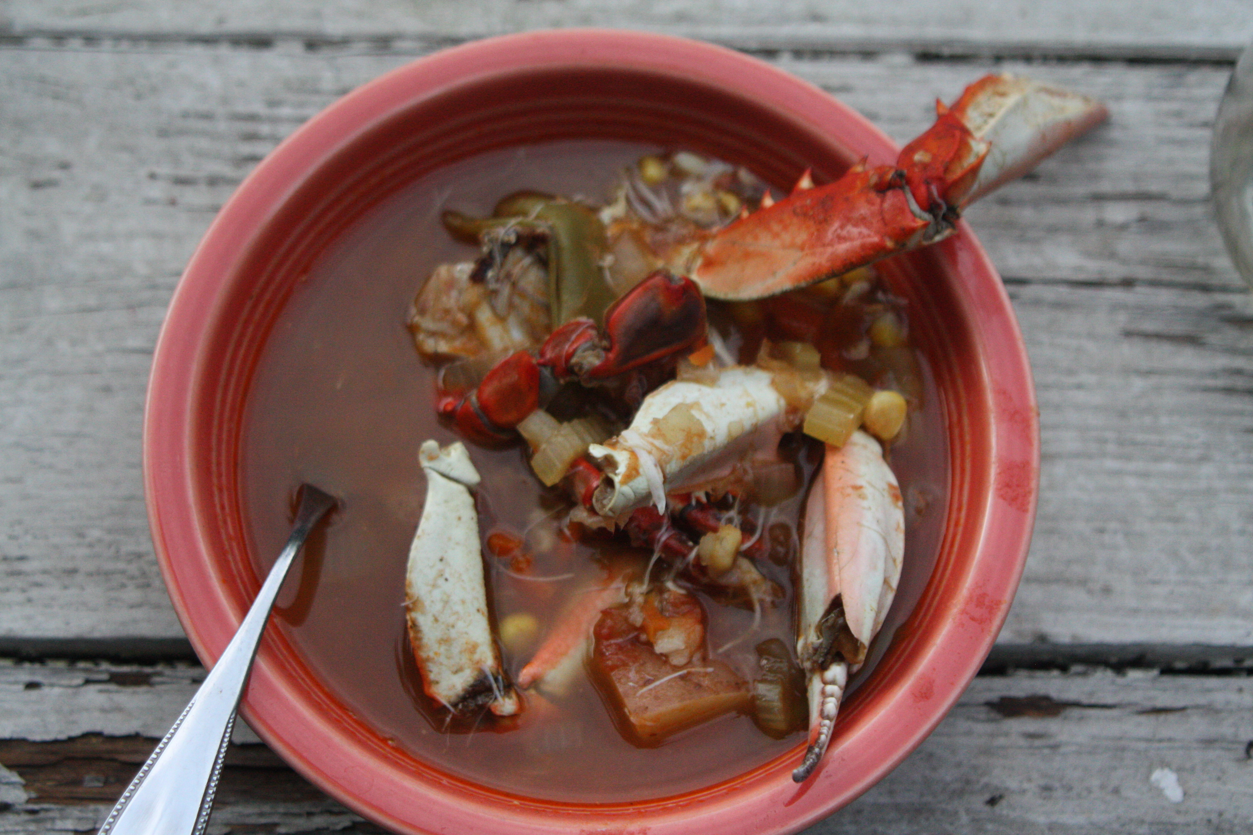 Once you’ve had your fill of crab, you sit and pick a few more for the meat. Put that meat in a bowl. Of course, part of the reason you’ve had your fill is because you’re tired of picking. Which means you take the lazy way out of putting those leftover crabs in your soup.