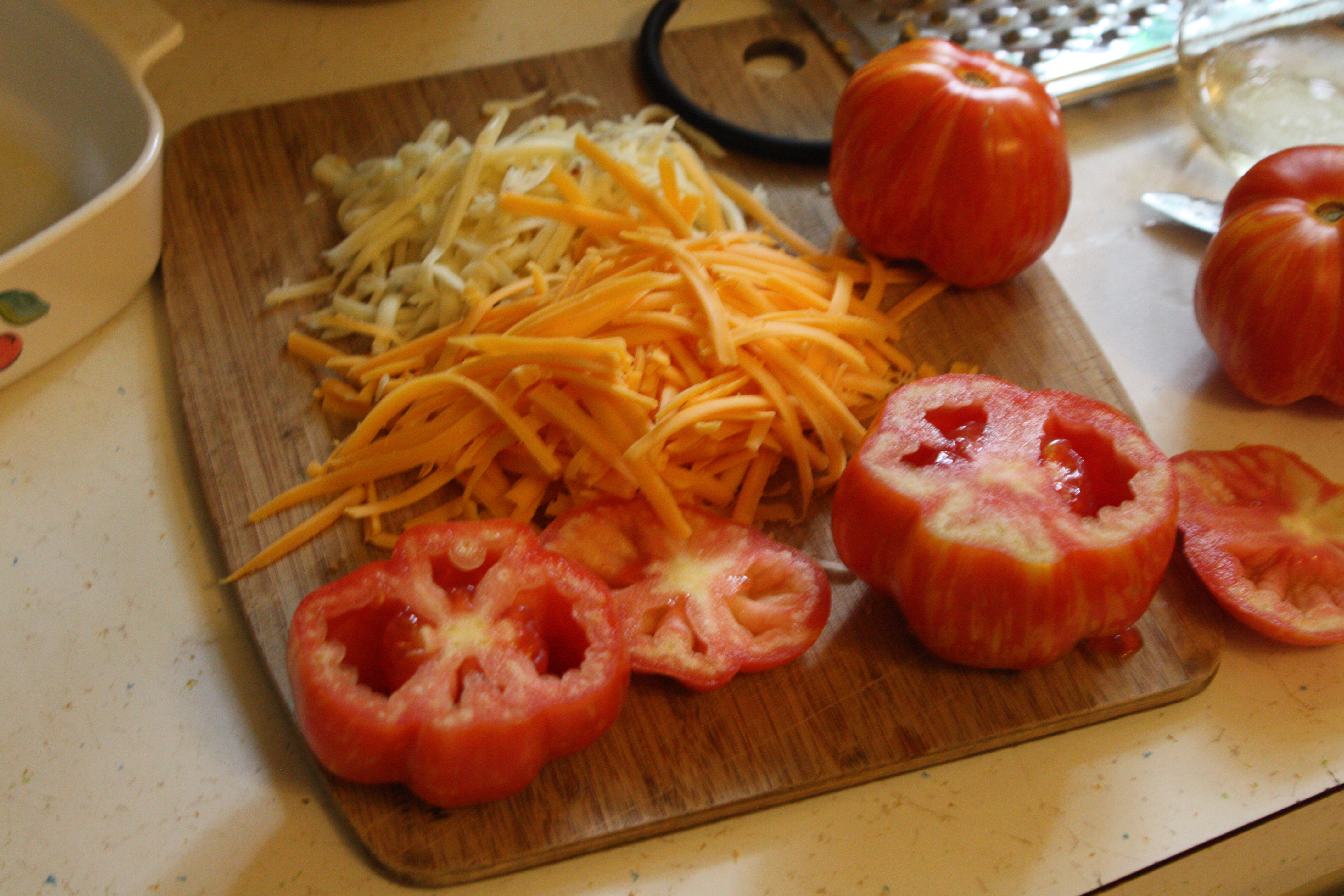 I used the leftovers from a recent Mexican inspired dinner – a stir fry of summer squash with beans and rice – to stuff the tomatoes.  I alternated layers of the rice and beans with shredded cheese and fresh salsa to keep everything moist.  With the rice & bean mix the top layer, I covered the baking dish and popped it in the oven at 350 for about a half hour.  At that point, I removed the cover, topped with more cheese and placed it back into the oven until the cheese on top melted, about 15 minutes.