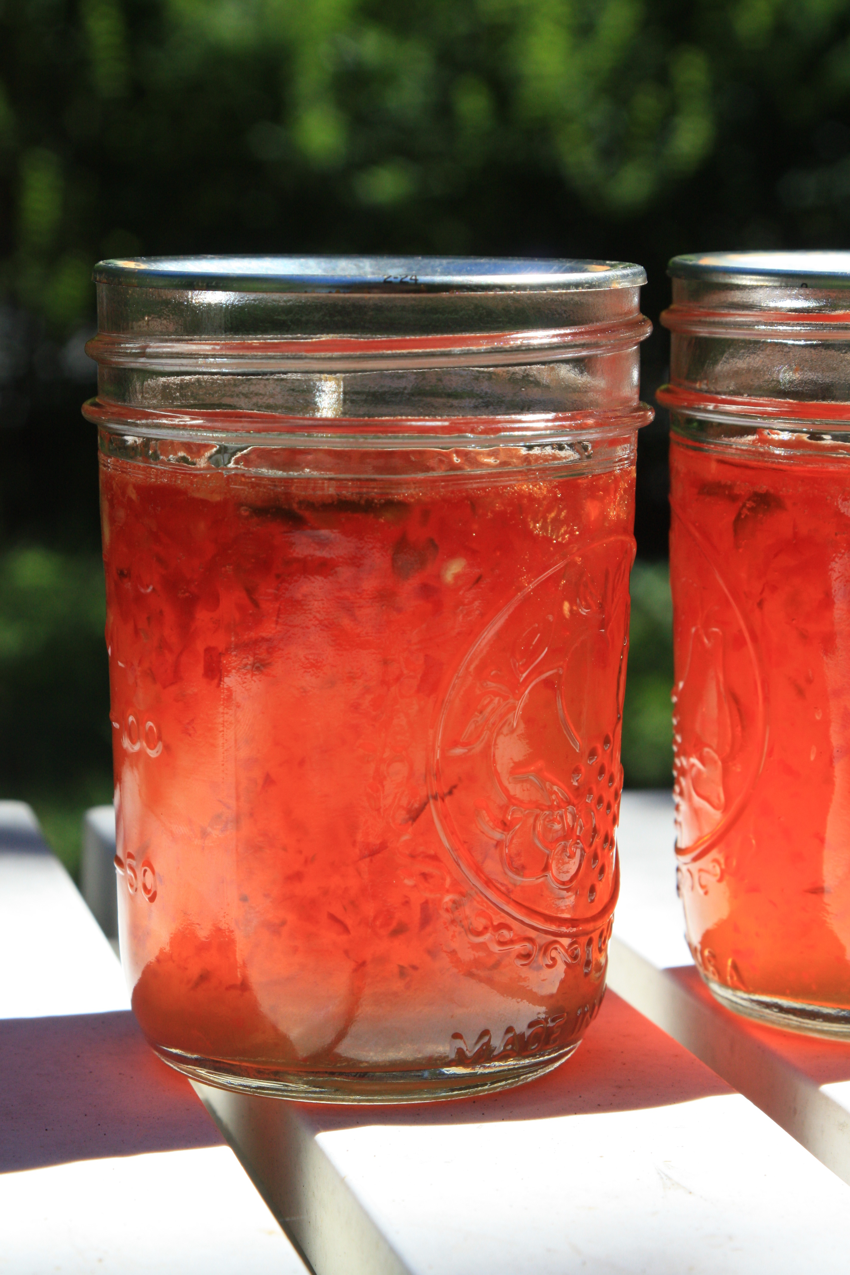 IMG_4999I used a variety of sweet red peppers (red bell and some sweet Italians I managed to grow) as well as red and green jalapenos.  The resulting jelly is an orangy-red with little flecks of green, quite pretty.  Edie prefers it served with a nice cracker & cream cheese, although Carla says it’s also lovely on chicken towards the end of grilling.