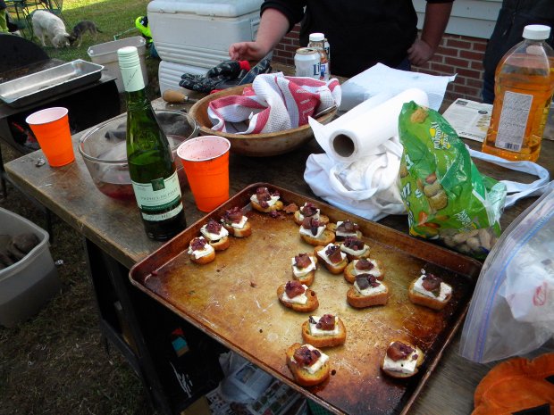 Despite my predisposition to not taking the time to properly present my food, Jerry sometimes calls on me to lend him a hand with some of the larger dinner parties he serves. I like working with Jerry – cooking with friends being one of my favorite pastimes – because we cook well together, it’s understood there will be college football on in the background the entire time and if necessary, I can bring Edie girl along, who will get her own task list. Girl can assemble some smoked duck bites with fig preserves like nobody’s business.