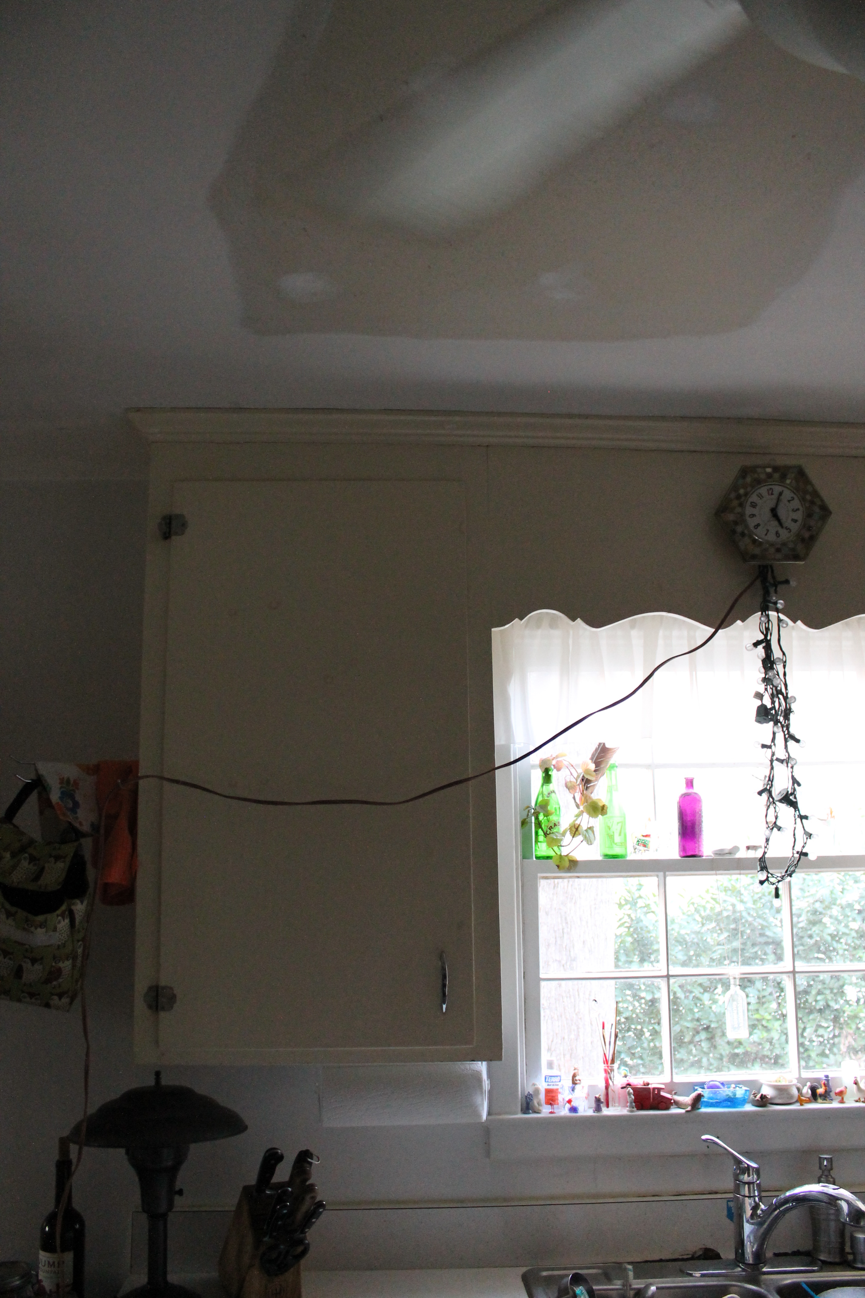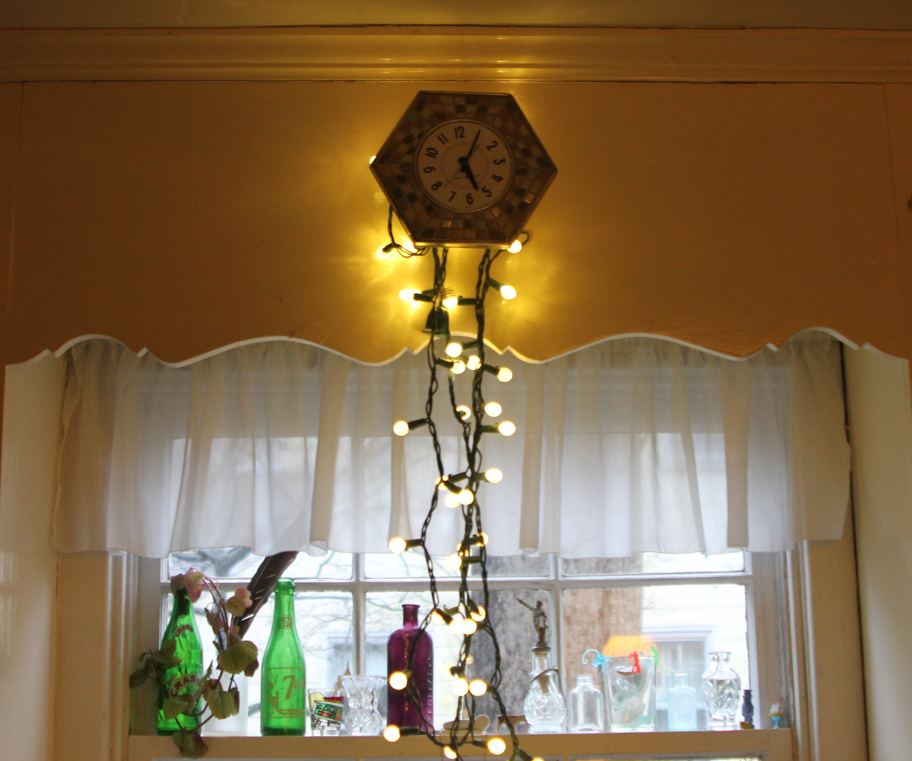 IMG_8762Best of all, Joe was able to keep the outlet over the sink a working one, so I can still have my string of Christmas lights slung over a nail, with the outlet hidden by the non-working vintage clock set for just after 5:00, so that it’s always happy hour in my kitchen.