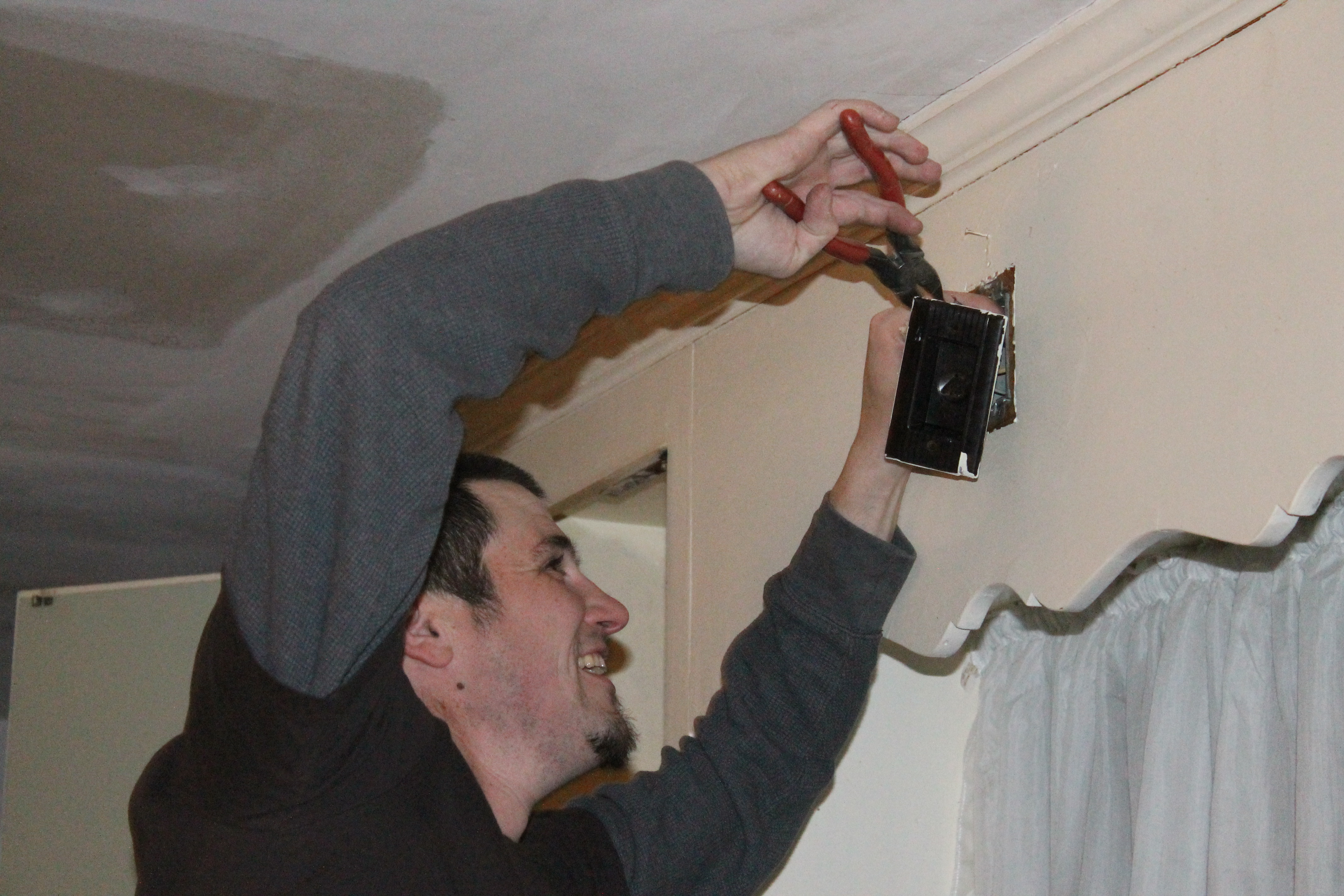 IMG_8126Clearly, not optimal.  I suddenly had a few ideas as to how we could run electricity through the cabinets with minimal intrusion and next thing you know, I was messaging my friend Joe, an electrician by trade, to see if my idea would fly.  I knew Joe could take care of the whole thing in less than an hour if I could get him over here. IMG_8137Turns out, he was able to drill through the top corner of the cabinet to access the wiring running above the sink, then run wire down through the back corner of said cabinet and out the bottom in order to install an outlet mounted on the wall, just under the cabinet.