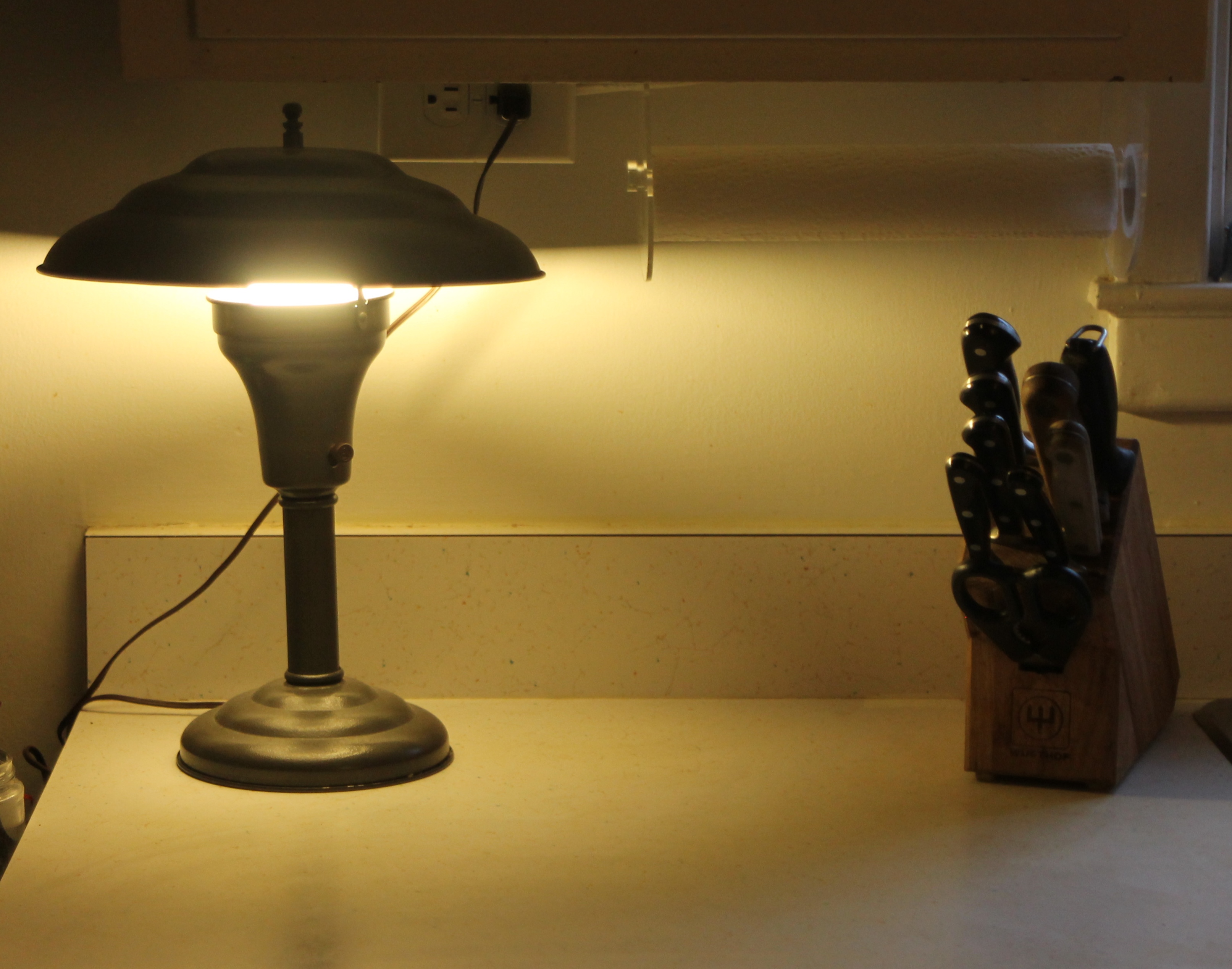 So there I was, lamp in hand.  I plopped it on the counter and just curious, dug up an extension cord and plugged it into the outlet above the sink.  Which looked like this: