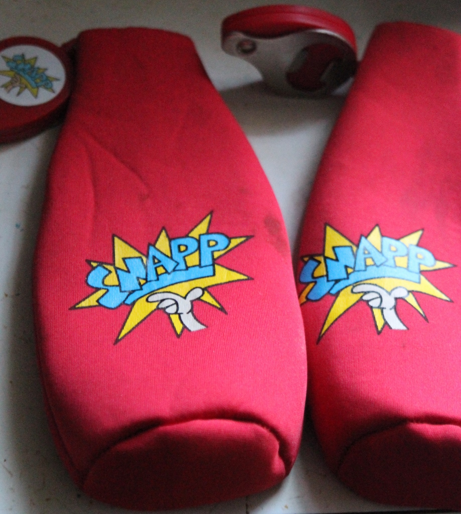 Also acquired at Brooke & Nick’s wedding were this pair of bottle koozies with bottle opener ATTACHED to the koozie via a retractable cord that also has a magnet so it attaches to the zipper. Genius. Also, Edie claims ownership of these, so can’t just toss.