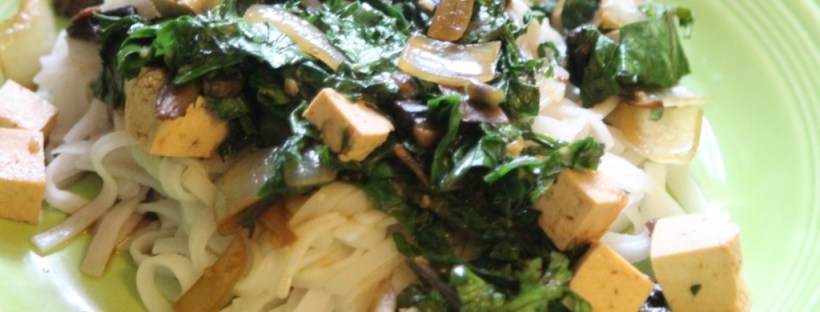 Remember last week’s threat to make that recipe I shared with you all using kale? Well, I tried it and while I was at it, mixed it all up, using rice noodles instead of just rice and then because I had some mushrooms I had to use up, I threw those in as well as some onions for flavor.