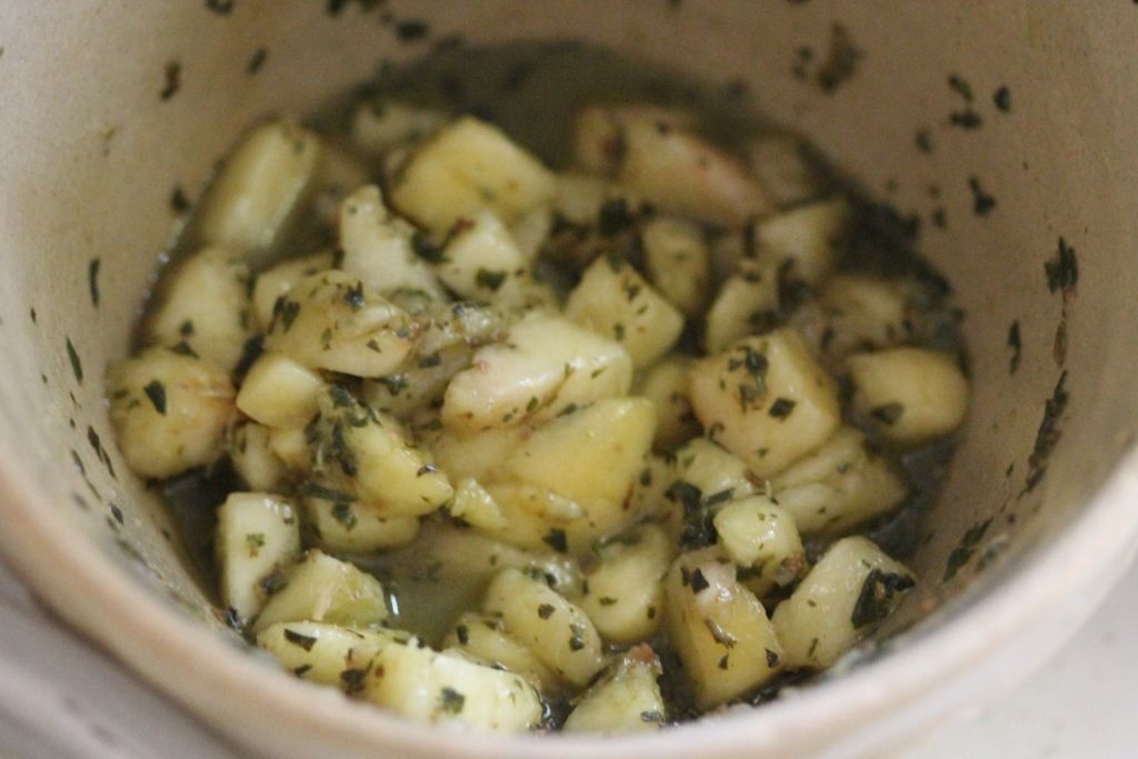 I peeled and chopped the peaches, tossing them with a bit of lime juice to keep them from browning and a sprinkle of sugar to balance the lime juice. (Note: You could use lemon juice instead or fresh lemon/lime juice, but the bottle of lime juice was the closest, so I grabbed it.) I only meant to taste the peach with the pesto as part of my experimenting, but I accidentally dropped the pesto into the bowl of peaches, so after tasting it, I just went ahead and stirred a spoonful of pesto until it looked like this: