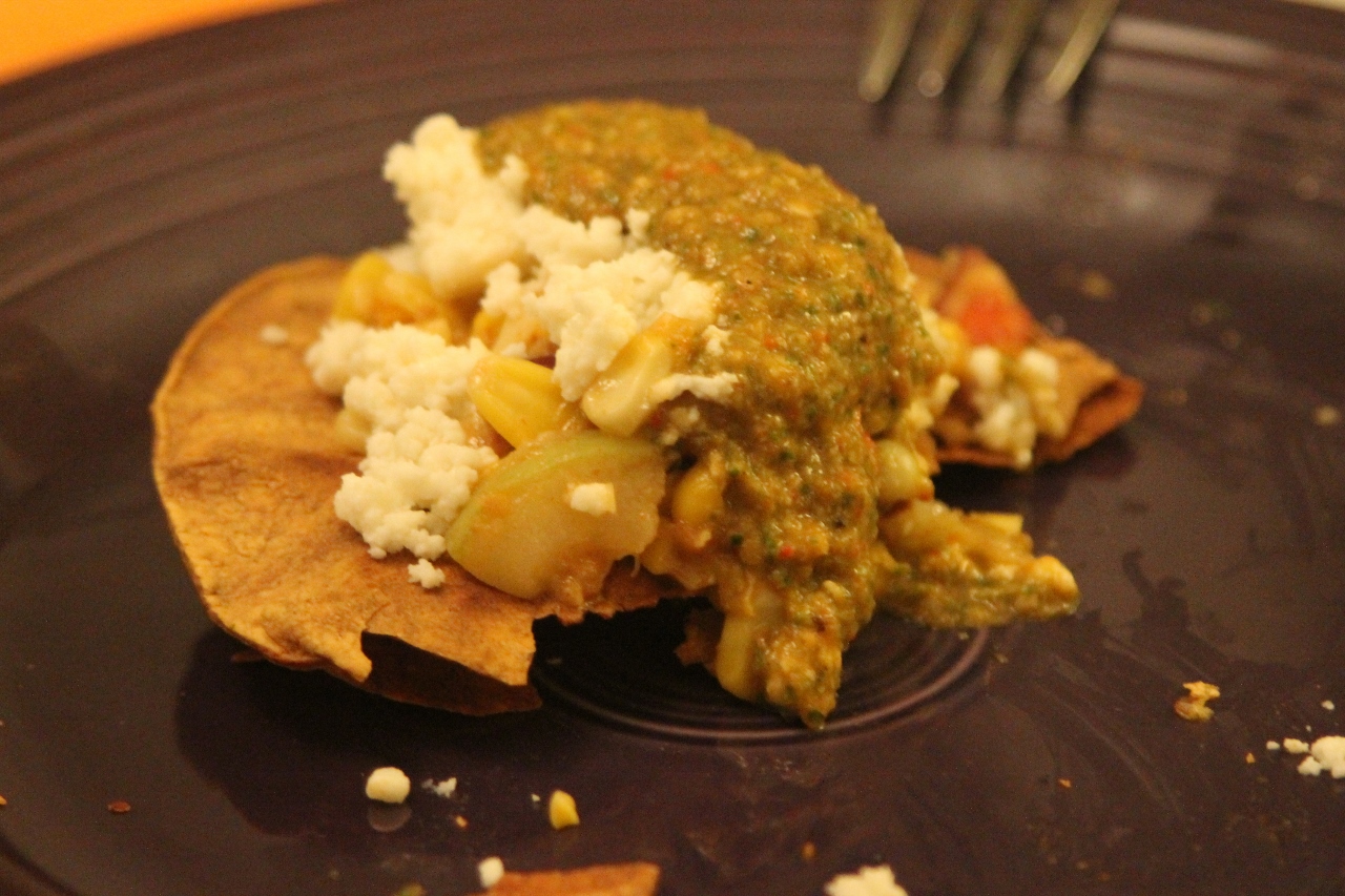 Veggie tostado with squash, corn, pepper sauce and queso.The original recipe called for toasted pumpkin seeds, cilantro and olive oil.  Going with what I had on hand, I used walnuts, parsley from the garden and to keep things light,  bumped up the lime juice to compensate for skipping the olive oil and then added just a wee bit of water as needed.
