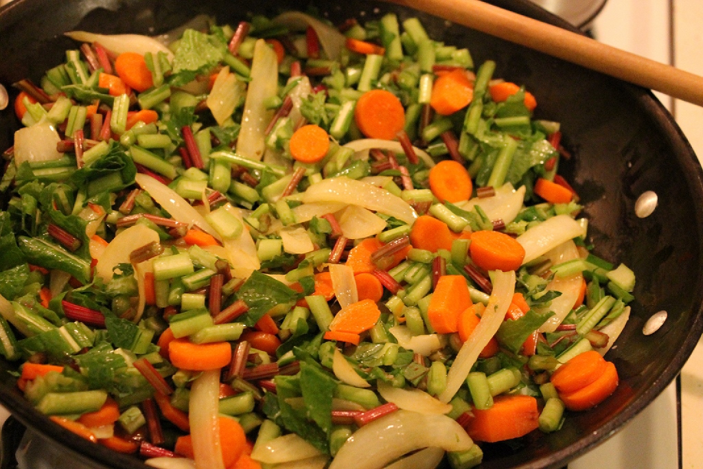 I had a slew of greens from various root vegetables I’d bought at market Saturday morning – beet, turnip and radish, plus a few stray stems of kale hanging around. When I cook with greens, I like to chop the stems separately and throw them in with the firmer vegetables that take a bit longer to soften as they saute, like the onions and carrots.
