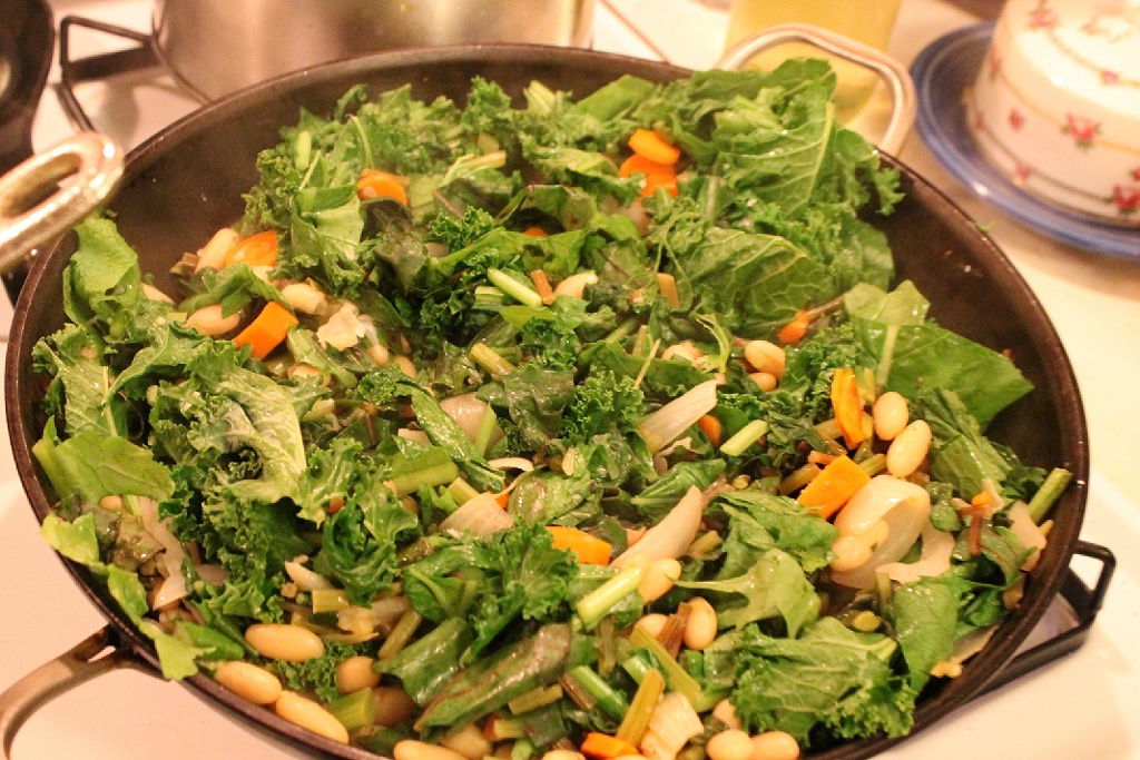 Sauté thickly sliced onion in some olive oil. When onions are translucent, add carrots, seasoning with salt. Cook 3-5 minutes or until carrots are soft. Add chopped stems (if using) and dash of wine, seasoning to taste with salt. When stems have softened, add a can (or two) of drained white beans and a healthy amount of minced garlic, adding wine to keep everything from sticking to the pan, slightly crushing the beans as you stir if you like. Sauté until fragrant, about 5 minutes. Add chopped or torn greens in increments if necessary and wilt, adding liquid (wine or water) and seasoning with salt and pepper as you go. Cook until you reach the desired tenderness of your greens. Serve over cooked whole grains (like barley or grits) with pepper sauce.