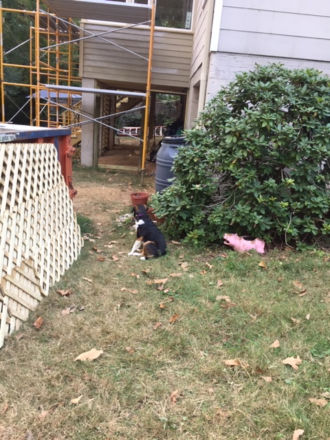 Which brings us to Betsy beagle. Having been the one most disrupted by losing the back porch and assorted spaces, she is delighted to have her porch back, as well as her rainy day/ too hot to be anywhere but under the porch hiding spot under the sunroom, complete with her own private entrance under the stairs (so she won’t dig under the new lattice or rip it out like the old one). The day she noticed the lattice was going back up on her under-the-sunroom spot, she hung around the back of the house for the first time in weeks, sitting under the scaffolding while the guys worked. The day it was done, that dog wouldn’t stop smiling, which, if you know Betsy, you know she’s got a bit of a poker face. She’s not necessarily a smiler. (She also caught a cicada that day, so it was epically the BEST DAY EVER for our furry friend).