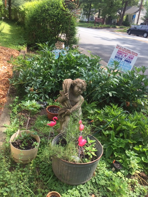 As for the rest of the garden, it is, as ever, evolving. The patch I’ve spent the last few years trying to eradicate of garlic chives is almost rid of them – and I’ve started working in some newer plants to take over. Bee balm, yarrow, joe pye weed, things that pollinators like. Nearby there are my zinnias and cosmos, while scattered about the yard are pots full of flowers and herbs I’m attempting to start from seed. I also have added a new statue: