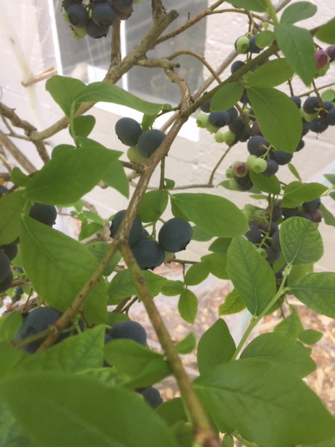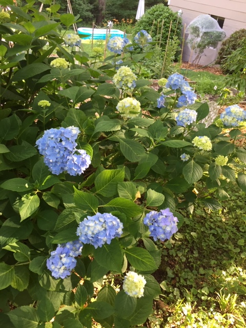 Elsewhere, the blueberries are starting to ripen, protected from the birds by bridal tulle – I saw where a friend used this method on her tomato cages and I’m considering trying that to protect my tomatoes from the squirrels and deer this year. So far the deer have only eaten my peas and patchouli plant, but that doesn’t mean I want them to think the garden will continue to be a buffet for them. They’ve gotten awfully bold once again, coming within a few feet of Betsy beagle while she loses her everloving mind at them. I’m trying blood meal, which came recommended, to see if that staves them off.