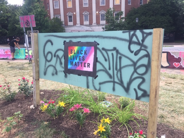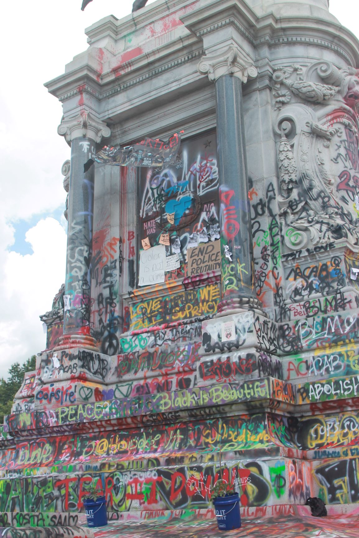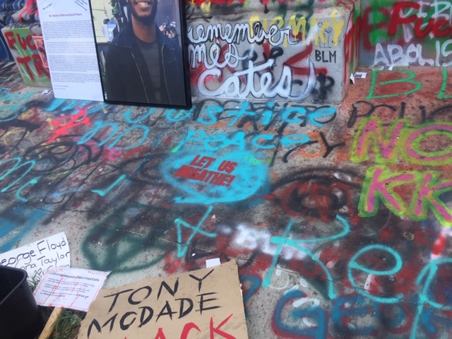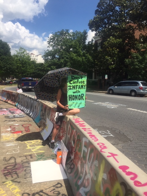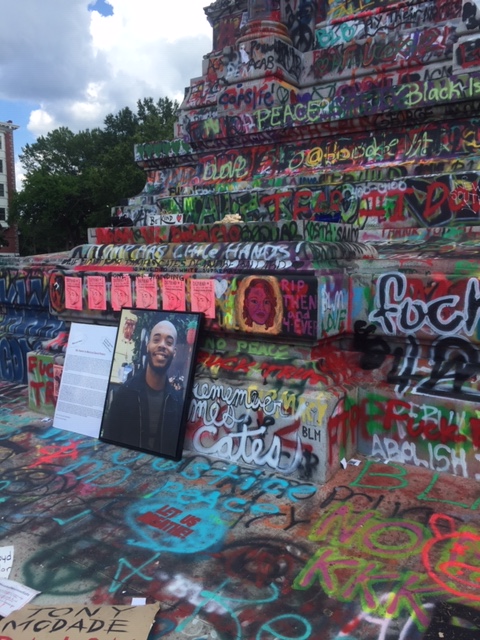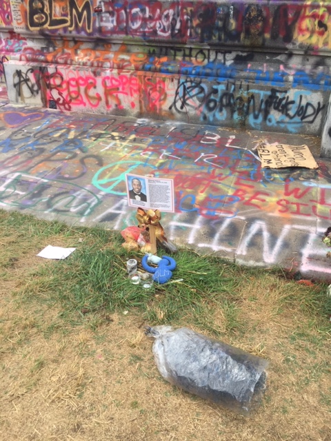 Circling the base of the statue are tributes to Black lives lost to police brutality. There are larger tributes on opposite sides of the base for Elijah McClain. Breonna Taylor and George Floyd‘s faces are stenciled and painted in multiple places around the park. People of all walks of life mill about, paying tribute, photographing themselves, photographing the space, bearing witness. The smell of marijuana, newly decriminalized in the state of Virginia, wafts in the breeze. There is a quiet, peaceful hush in daylight hours to a place that has been host to weeks worth of protest, sometimes violent.