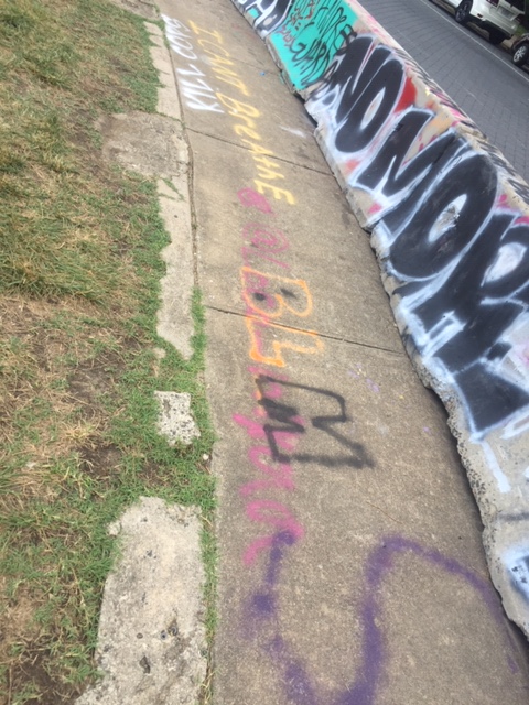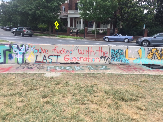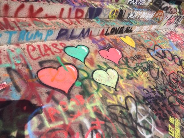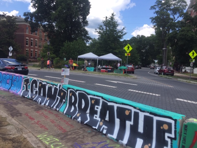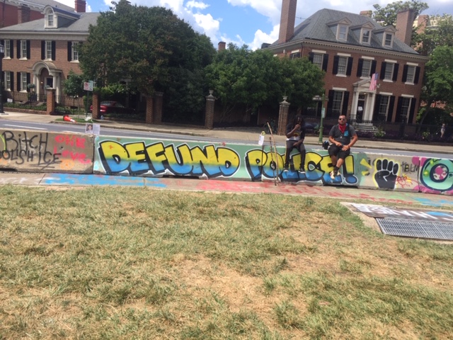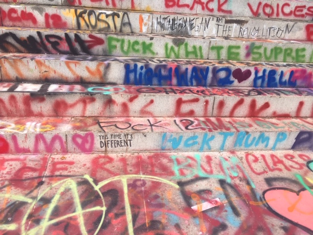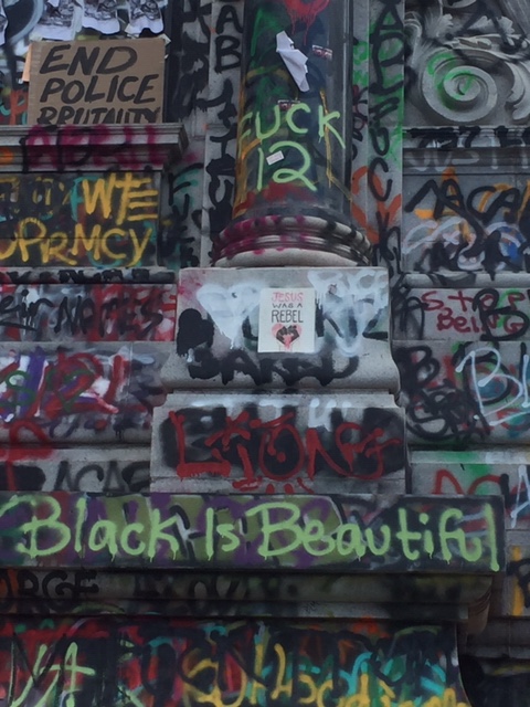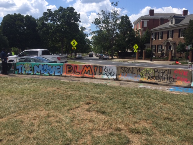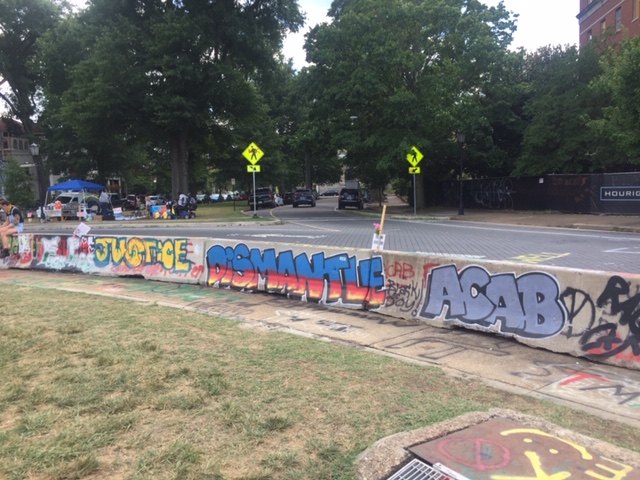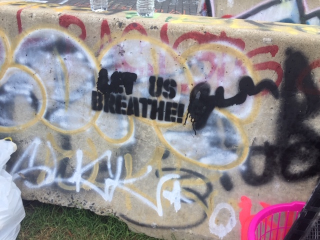 It’s not just the base of the statue covered in messages – the streets leading to the park as well as the concrete barriers encircling the park have been decorated in colorful graffiti. There are layers upon layers of messages, freehand and stencil, on every possible surface, creating a kaleidoscope, all protesting the same thing – white supremacy, police brutality. Over and over, the phrase, “Let us breathe”.