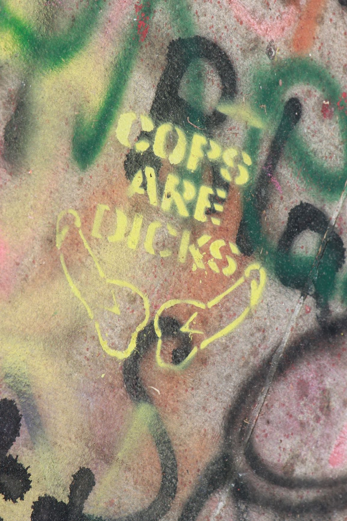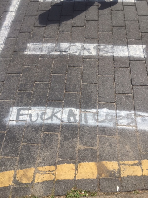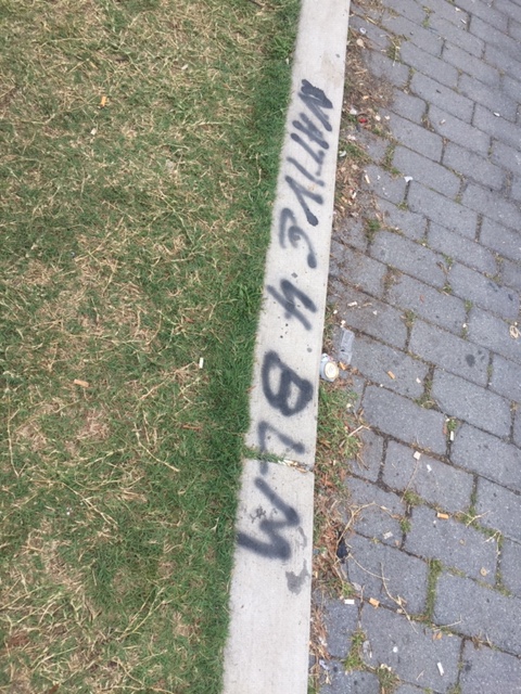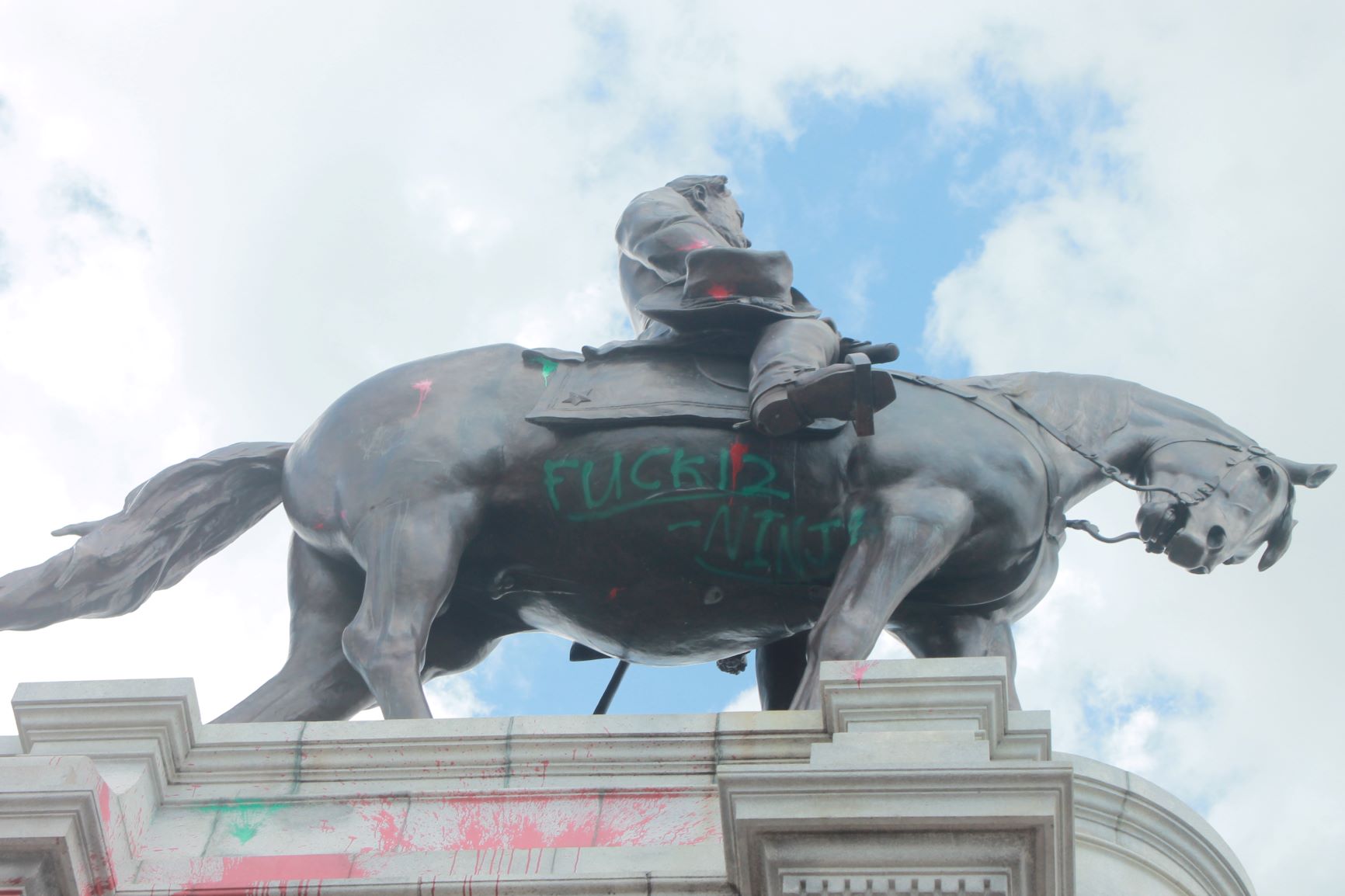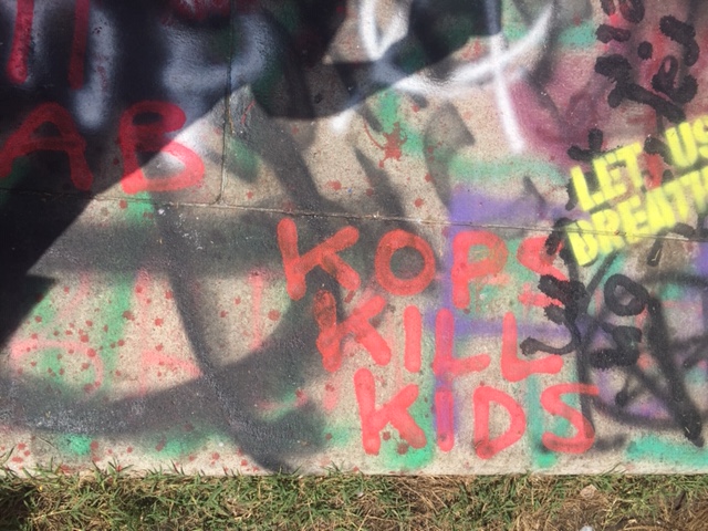 It’s not just the base of the statue covered in messages – the streets leading to the park as well as the concrete barriers encircling the park have been decorated in colorful graffiti. There are layers upon layers of messages, freehand and stencil, on every possible surface, creating a kaleidoscope, all protesting the same thing – white supremacy, police brutality. Over and over, the phrase, “Let us breathe”.