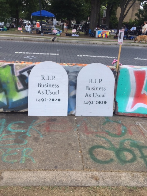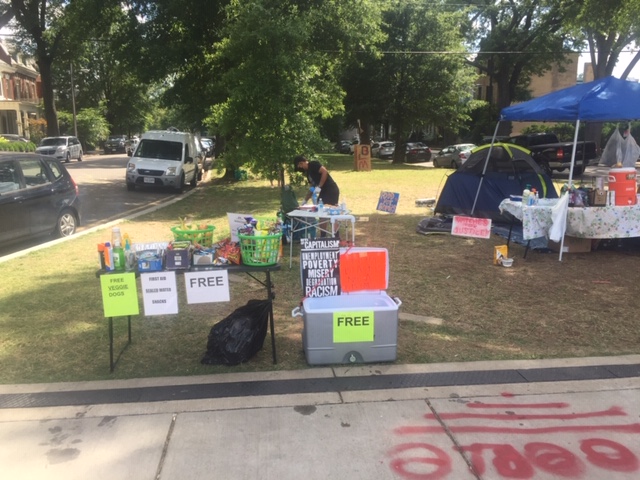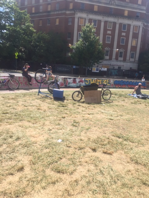 On the outskirts of the park, on surrounding corners and fanning out down the intersecting streets are mutual aid stations – water, food, first aid, even a booth registering voters. In the park itself, in addition to the memorials and tributes, is a free bike repair station as well as a free little library. Community for and by the community.