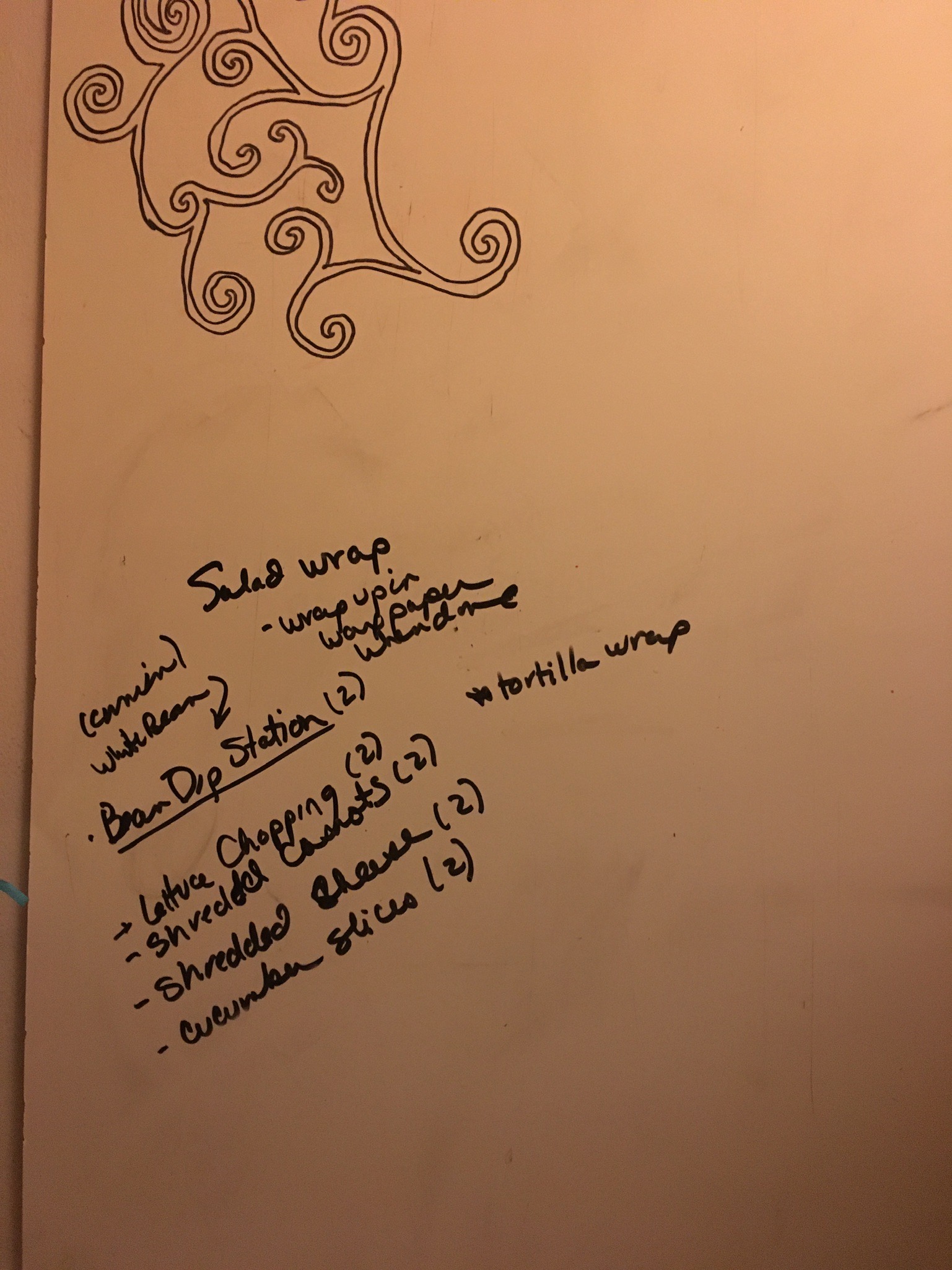 Teaching a cooking class means not just having a recipe selected and a plan for how you’re going to approach it, it means a grocery store run for ingredients and making sure all your equipment is good to go. The first part of my week is spent preparing for Wednesday’s class in some form or another – recently, I plotted out my approach to class on the kitchen whiteboard while I was making dinner Monday night, snapped a picture with my phone and went to the grocery store with it Tuesday afternoon, wrote it up Wednesday morning to have on paper in class that afternoon. There are a number of constraints I’m working with on this class that is making me change my style of teaching somewhat, so it’s been stretching me in ways I didn’t know I needed. It takes up a lot of head space, but to be honest, that head space had been sitting pretty vacant, so it’s good to have something to fill it.