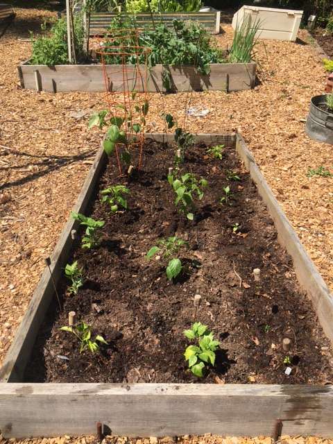 My summer squash has yet to put out anything edible, but the winter squash is sprawling over the entire bed to climb the trellis installed for the cucumbers across the aisle. I guess it figured if no one else was using it, it would? As for my pepper patch, in addition to the starts I get from my friend Cynthia, I had gotten some rather sad looking, struggling starts from another gardening friend – they didn’t have the time or space to nurture them into stronger plants, so they dropped them off to me. I wasn’t sure they would make it, but there they are, anchoring the front right corner of the pepper bed, offering up the first jalapenos of the season.