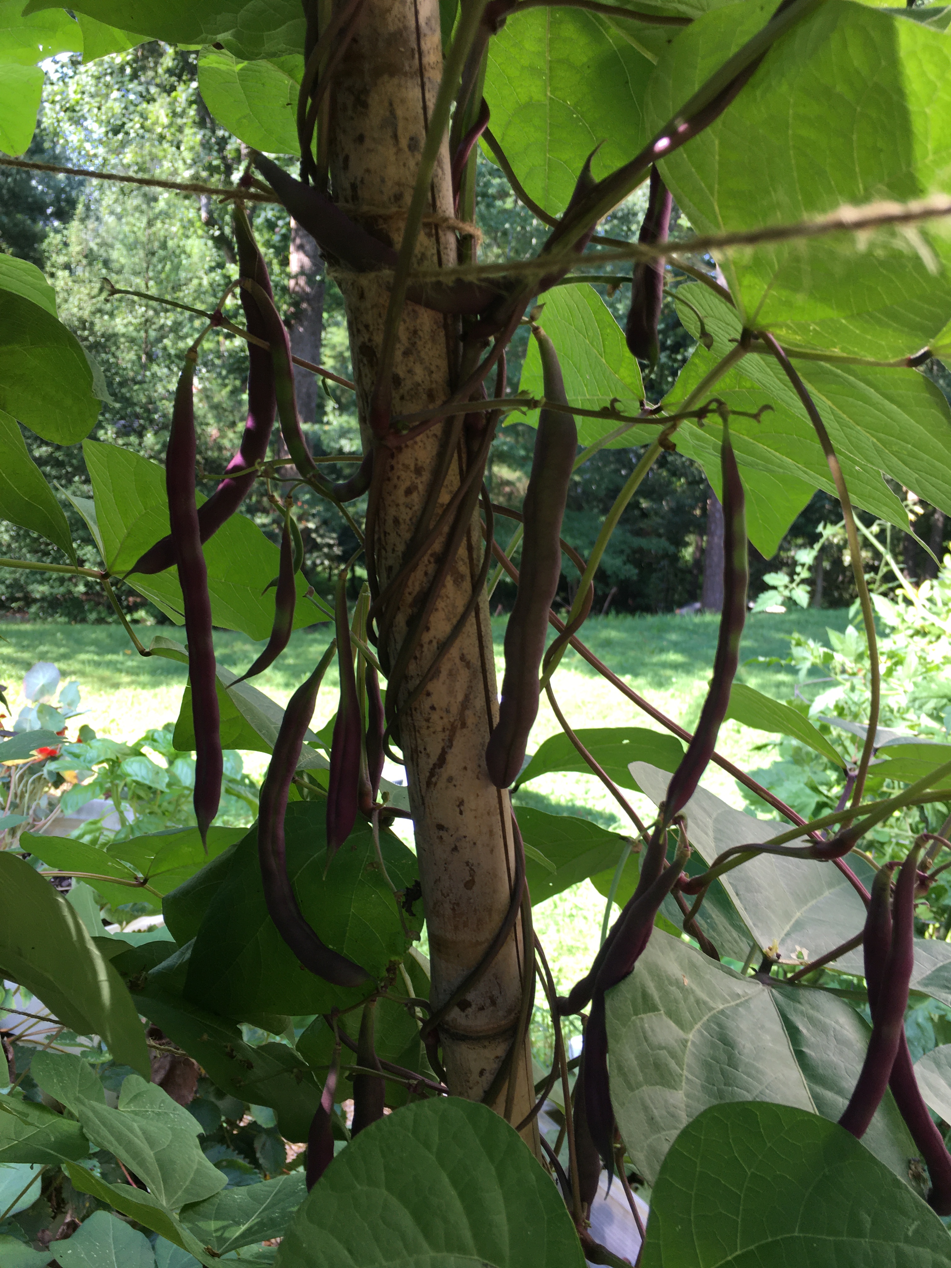 All of that is to say, I’ve had a lot of time to spend in my garden. There’s been other things I’ve kept myself busy with – sewing a new wardrobe, traveling, spending days on end making jam, even going to the gym regularly (!) among them – but the garden has always been my favorite place to work out things out. There’s always something new to be learned out there and even when you know what you’re doing, you’re still at the mercy of mother nature. I’ve had a heck of a time with seeds germinating this year, with March and April being too hot and dry, then May and June being too cold and wet with July being too hot for anything to do much. I had a plethora of cucumbers sprout up, but they have been slow to climb the new trellis we installed for them. Even my zinnia patch seemed to struggle, with a good number of the seeds I planted not germinating. Thankfully, the ones that did sprout seem to be filling in nicely so that I can continue my zinnia obsession. The rudbeckia that I bought because it was labeled “rude becky” has been more than happy to fill in the gaps in that bed, along with two (!) volunteer tomatillo plants. And the pole beans are going gangbusters – I’ve picked close to three gallons of them just this week. I planted purple ones this year, which are far easier to see to pick among the thick unruliness of their vines and green leaves.
