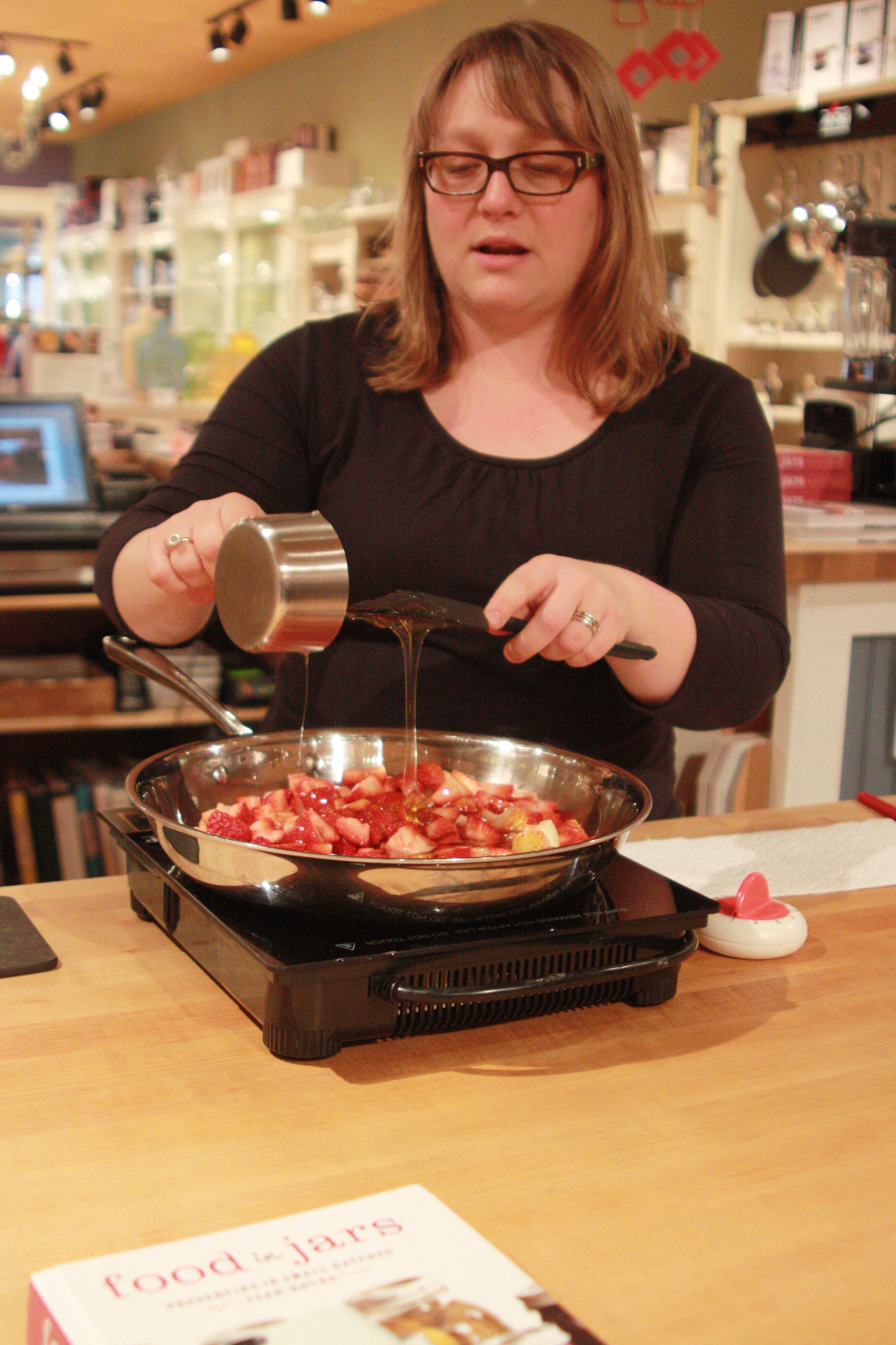 If you’ve ever taken any of my canning classes, talked to me for more than say, two minutes about canning or read anything I’ve written in the past few years about canning, then you might have picked up that I’m a bit of a fan of Food in Jars. I completely and totally credit the end of my years long struggle of making a decent batch of jam to Marisa McClellan, the woman behind both the blog and the cookbook. She introduced me to the concept of small batches – which also happens to be the subject of her latest cookbook, “Preserving by the Pint:Quick Seasonal Canning for Small Spaces“. She was here in Charlottesville last night at The Happy Cook, where she demoed Honey-Sweetened Strawberry Jam, on the first stop of her southern book tour promoting her new cookbook.