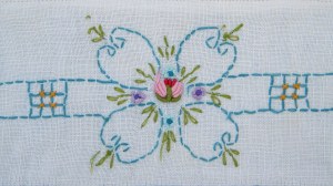 Among the items in the long ignored basket was this vintage embroidered tea towel that had definitely seen better days. I knew I could salvage the good part, but what to do with it? Do you see how flipping sweet that is? It needed a new life and one that would showcase it well.